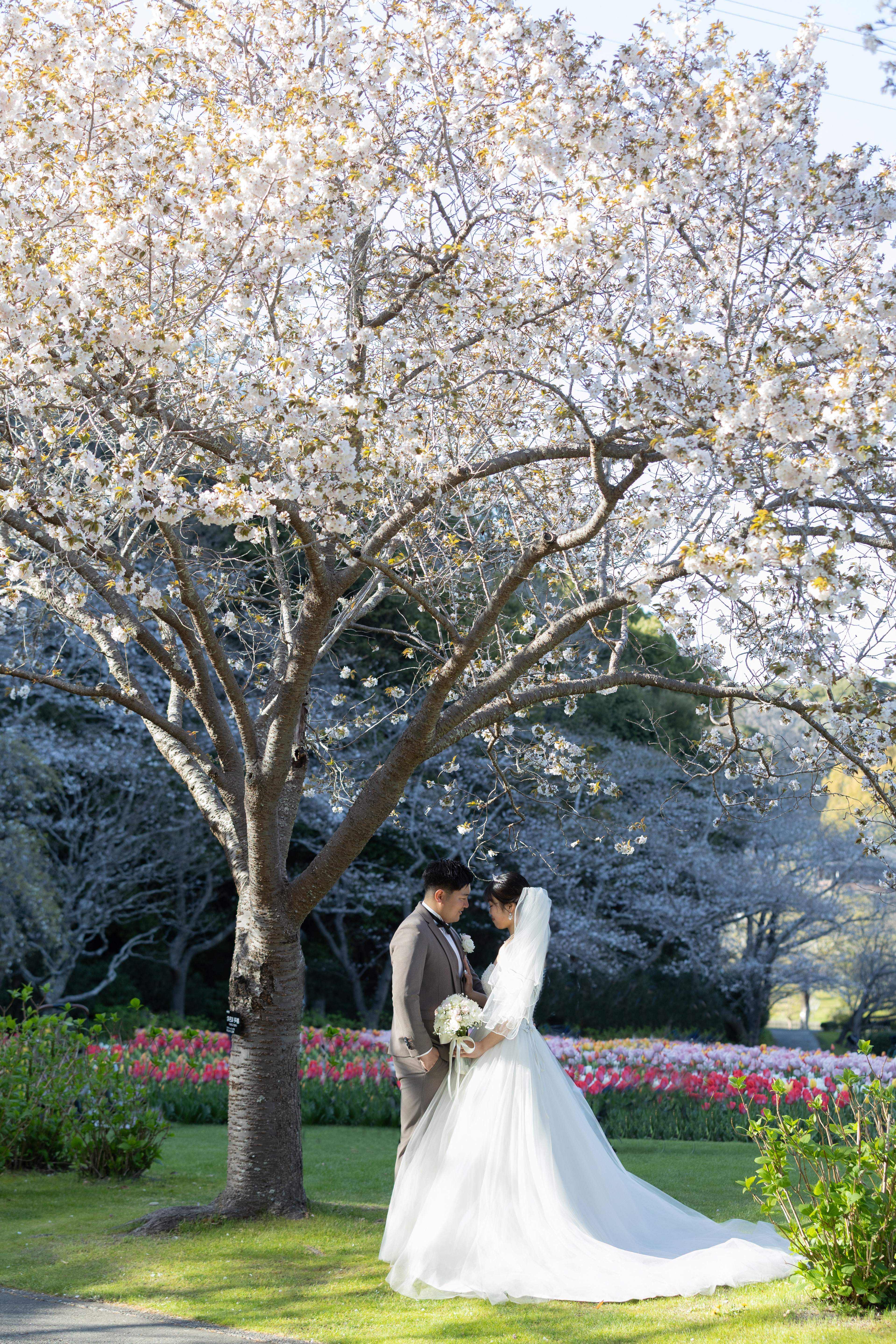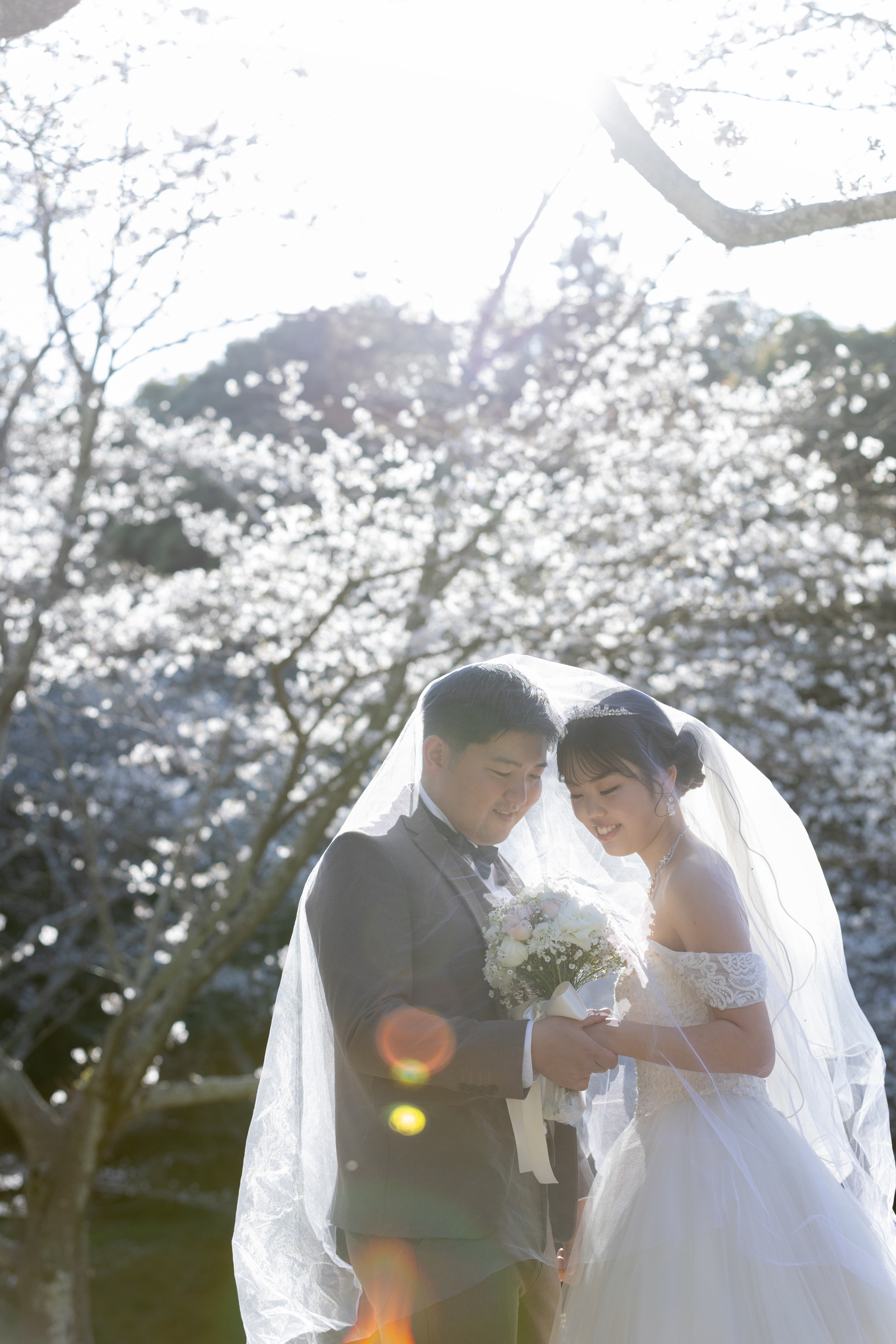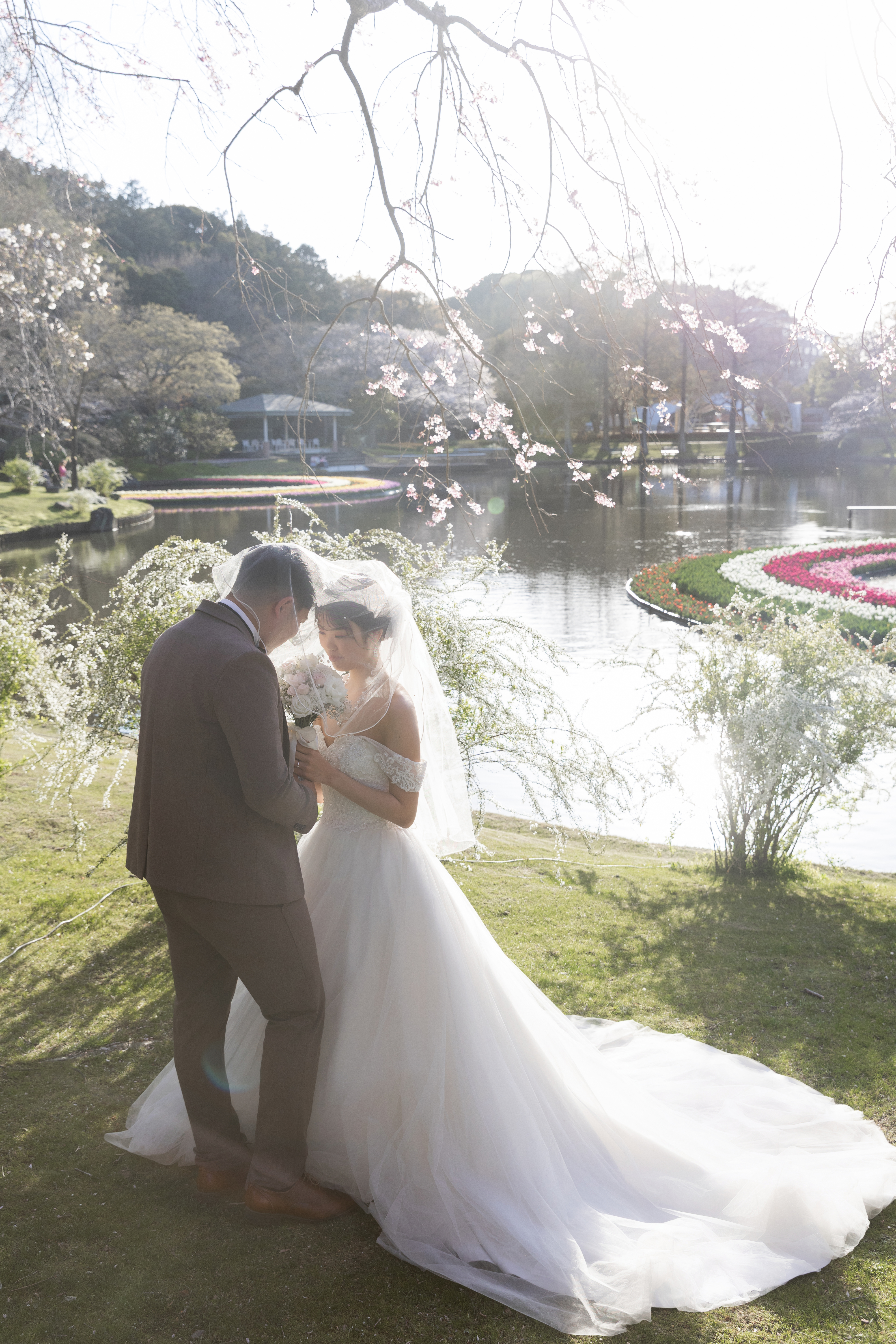 浜松城やフラワーパークでの撮影は、満開の桜とやわらかな光に包まれた、この季節ならではの特別なロケーション。水辺や花々に囲まれた風景の中で、おふたりの自然な表情を残すことができます。ドレスでの撮影はもちろん、桜の下でのロマンチックな雰囲気がとても素敵ですね!!